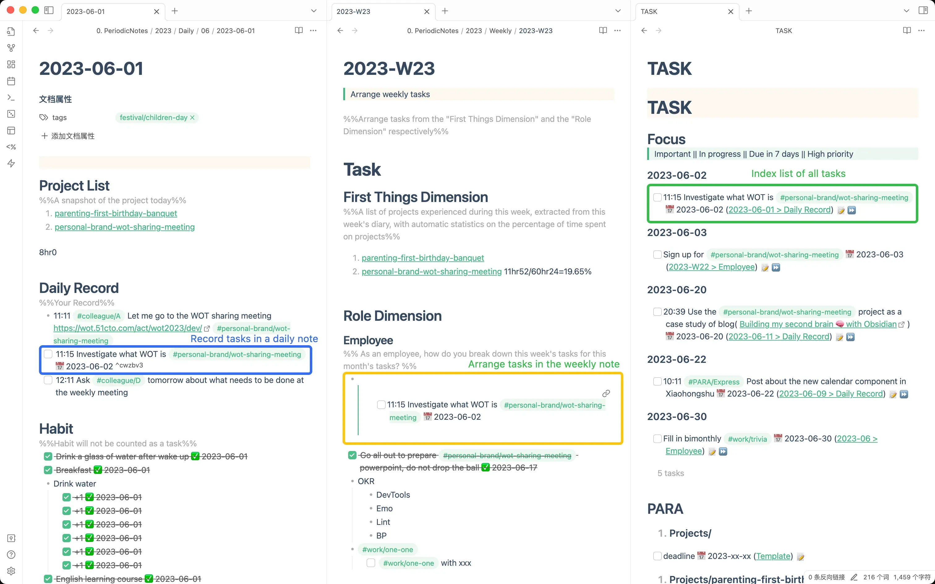 Since tasks collected are easily accessible in various modules, you can plan "Weekly Notes" and "Monthly Notes" by placing tasks as "Block Links and Block References" into corresponding modules as "this week's" or "this month's" to-do items!