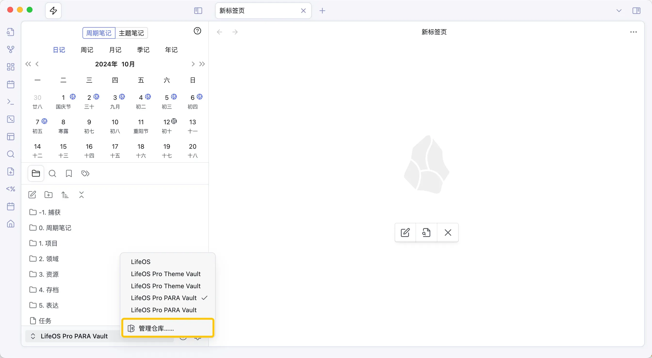 库是 Obsidian 的核心工作单元,相当于一个专属知识仓库。每个库可自定义插件、主题、快捷键,满足不同场景需求(如学习、项目管理、写作),而 LifeOS 提供了一个示例库!一般情况下,你只需要一个库,即 LifeOS 库。