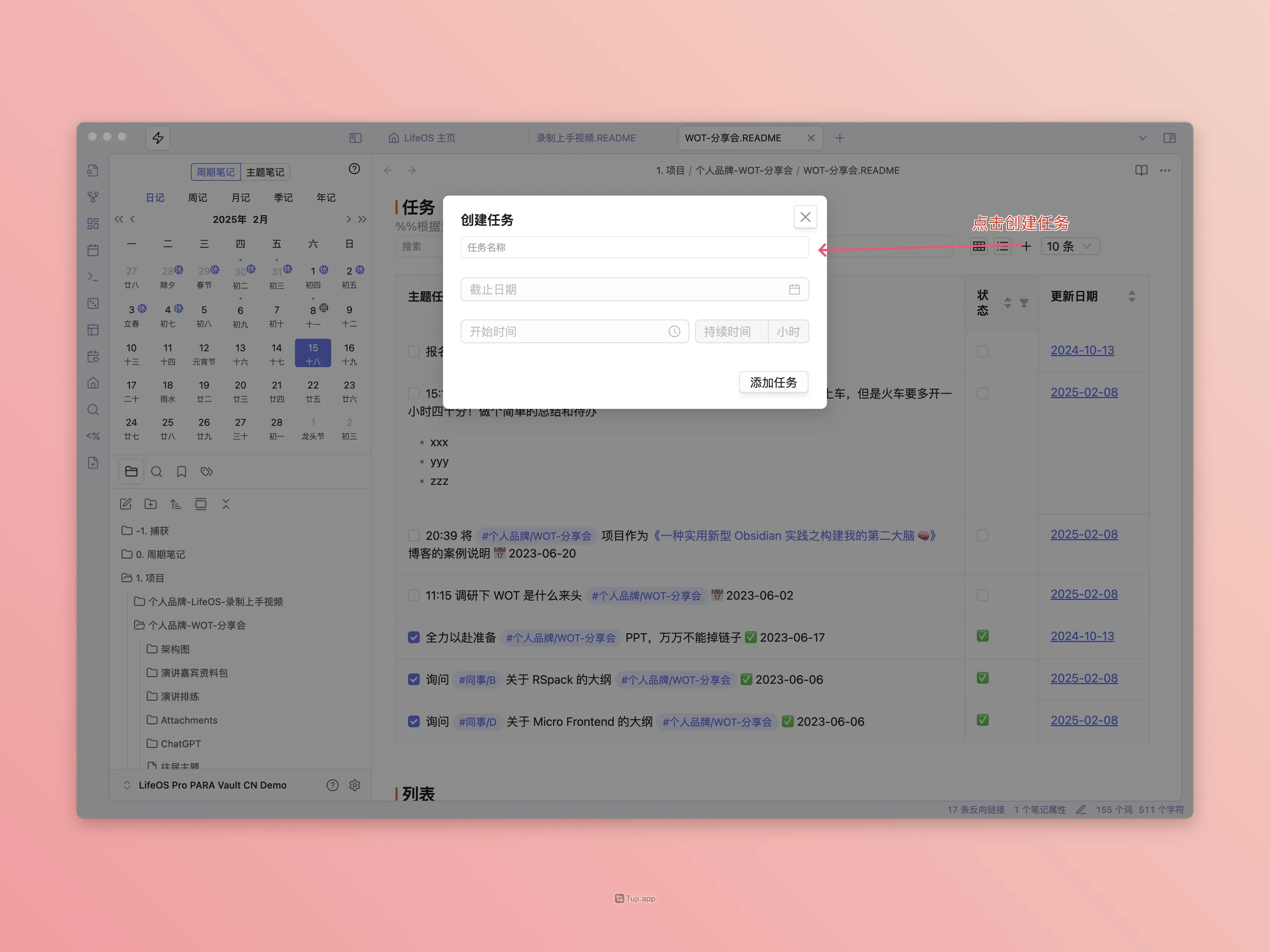 在笔记中创建『主题任务』、『主题闪念』、『主题文件』