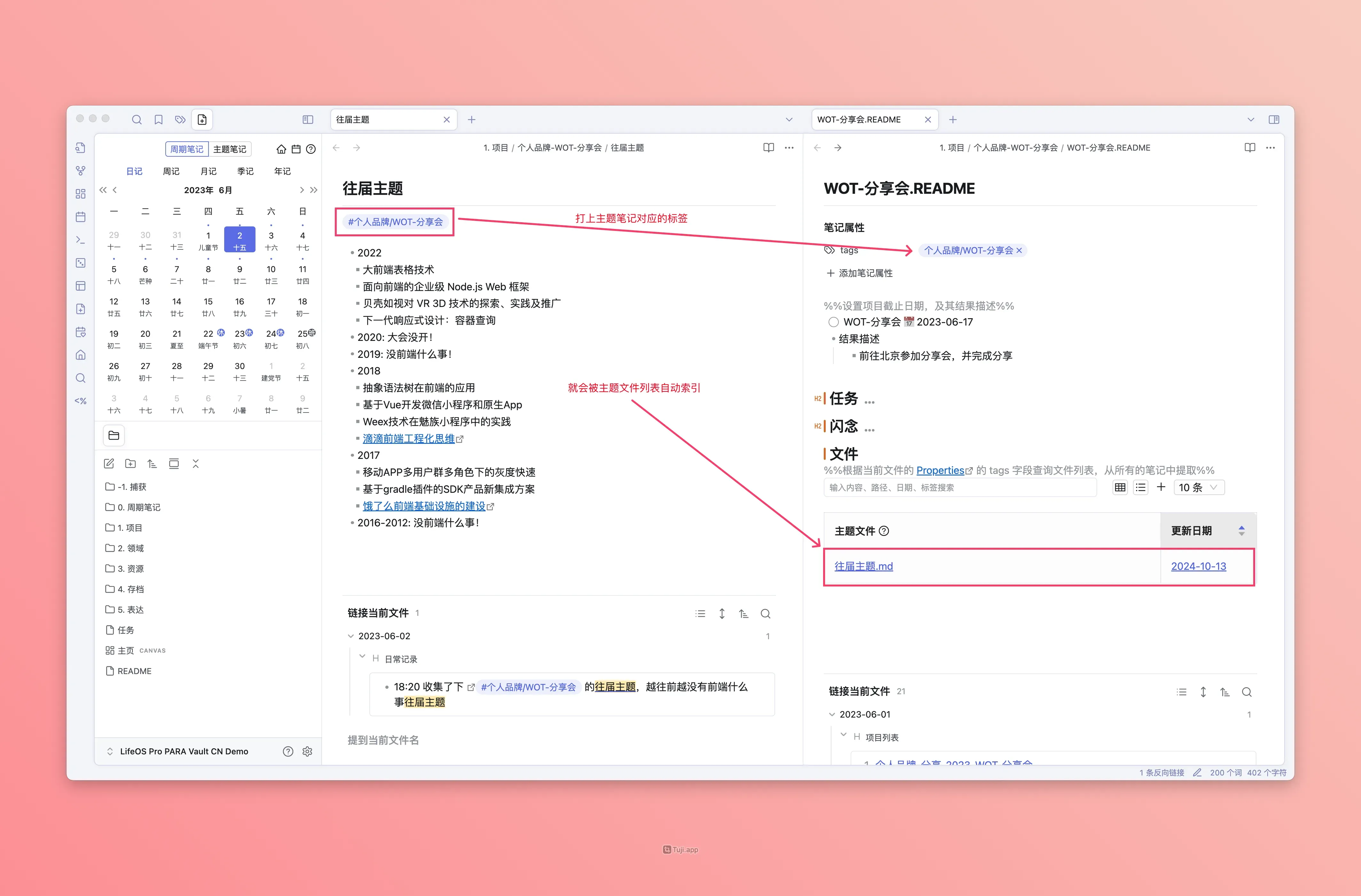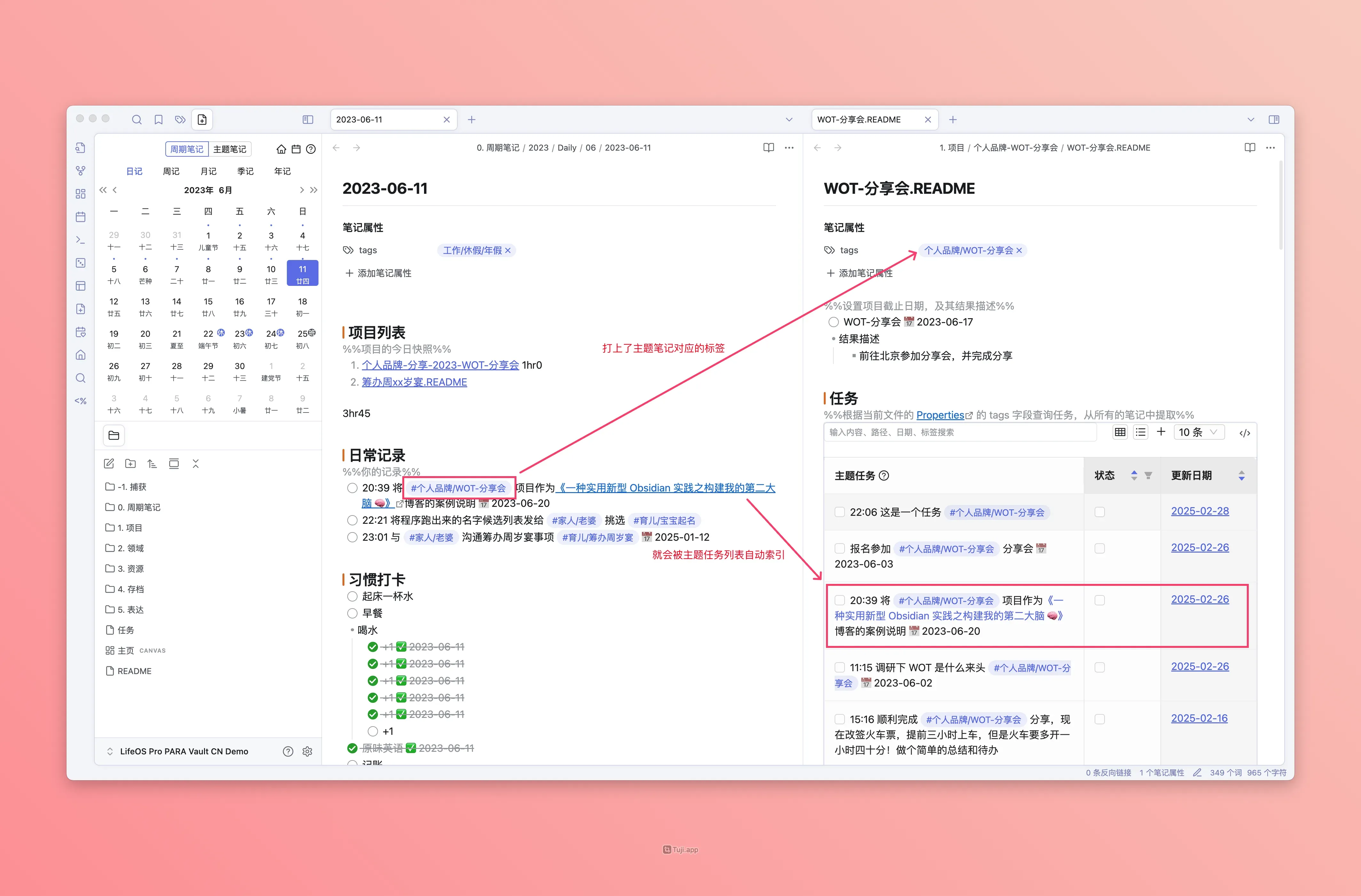 每个主题(PARA)都有一个索引文件(以 .README 结尾或者与文件夹同名),在该索引文件中,存在三种高级列表,即『主题任务』、『主题闪念』、『主题文件』,它用来索引散落在整个仓库中『被打上当前主题标签』的『主题任务』、『主题闪念』、『主题文件』!