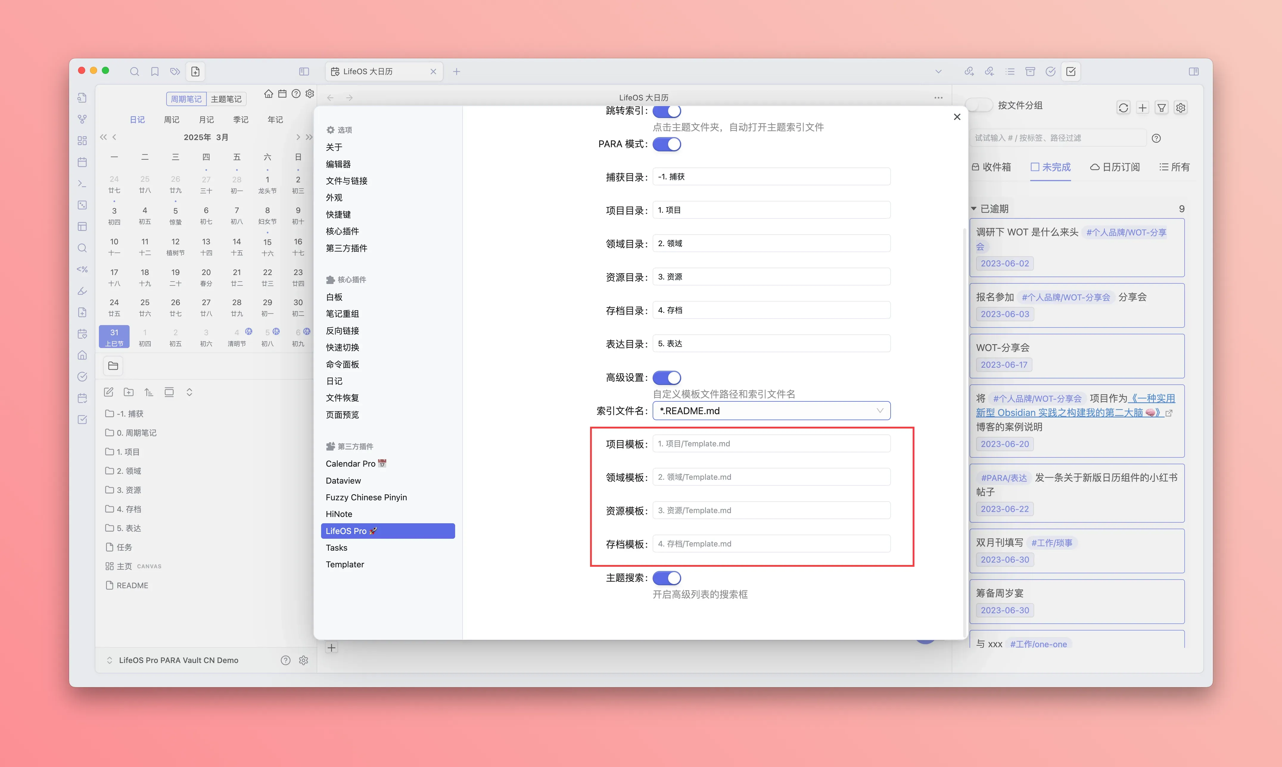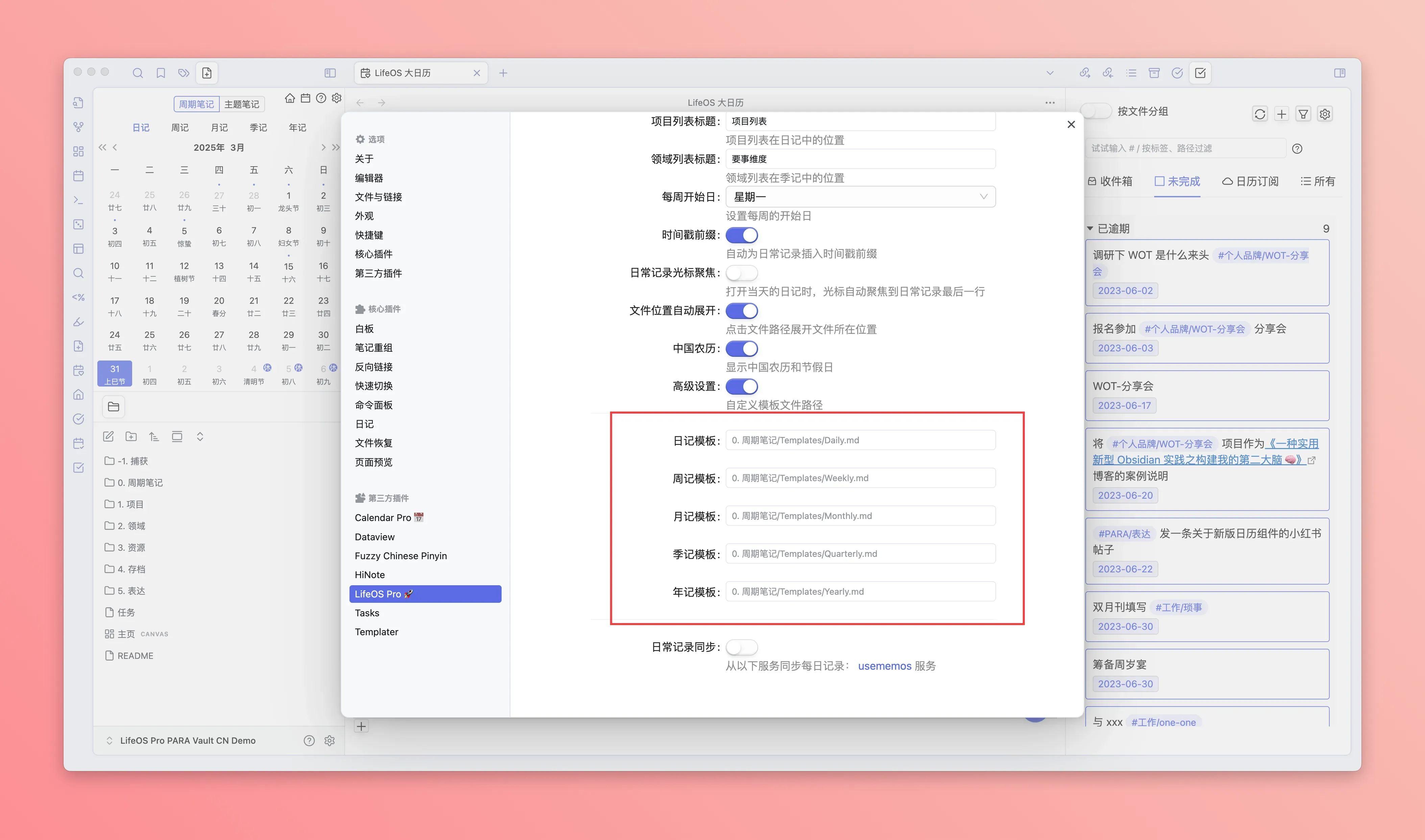 参考下图,配置你的周期笔记的模板文件,每次创建周期笔记都会调用对应的模板新建