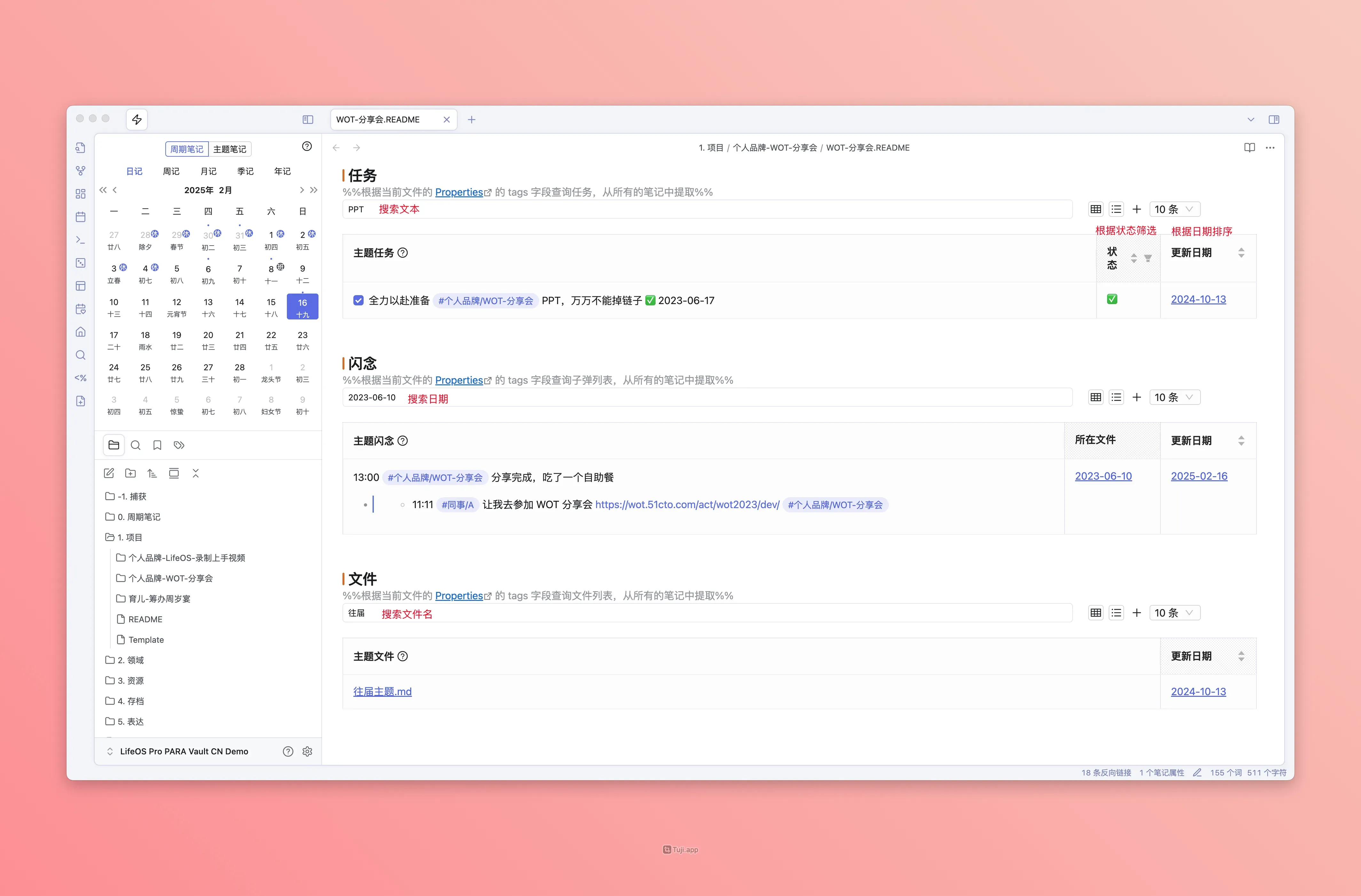 - 索引功能,支持搜索、排序、过滤,让你轻松找到散落各处的任务、闪念、文件!