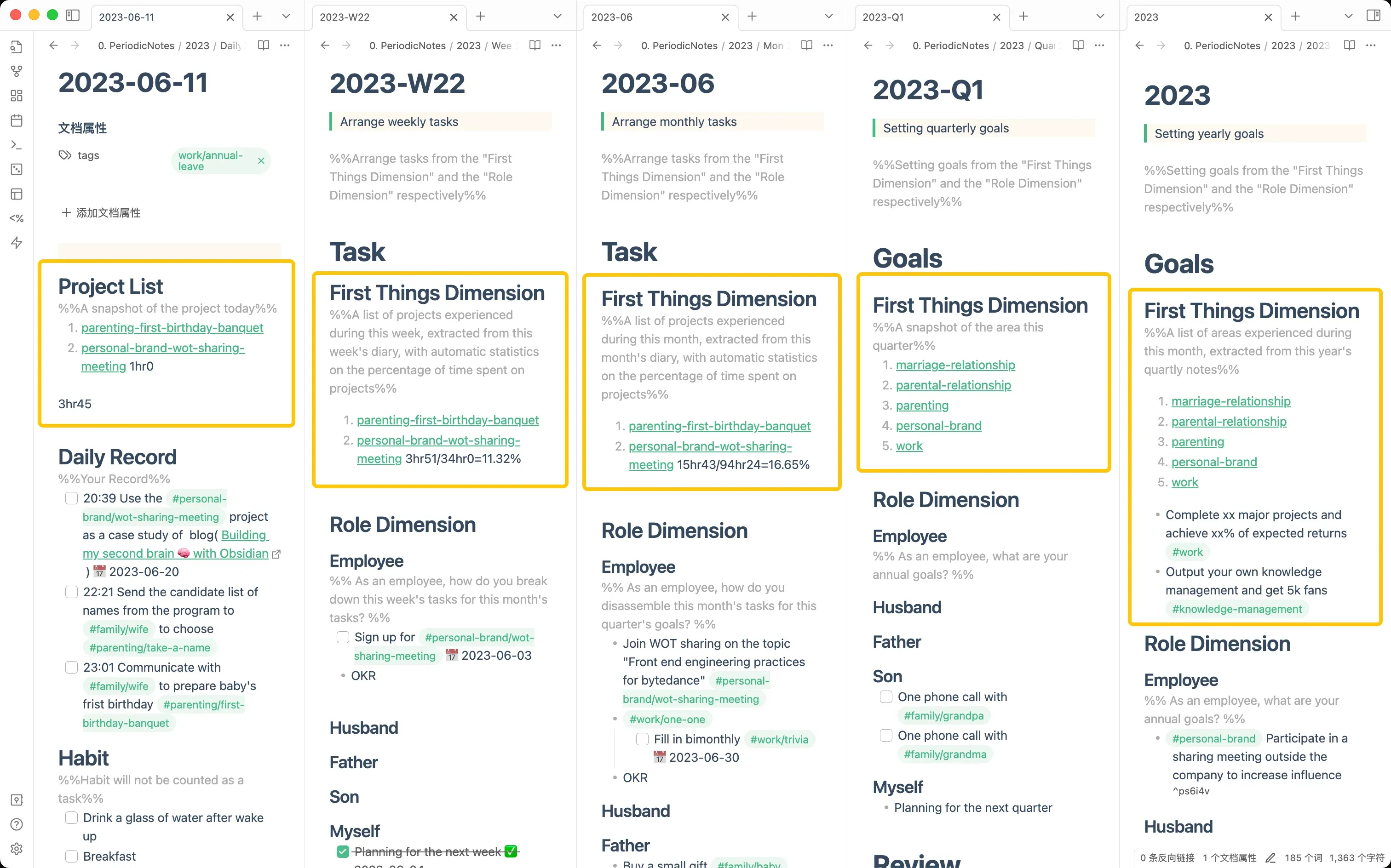 • The "Priority First Dimension" in weekly and monthly notes is a list automatically merged and deduplicated from the dailynotesof the week or month, which is used to arrange tasks at the project dimension and for subsequent reviews.