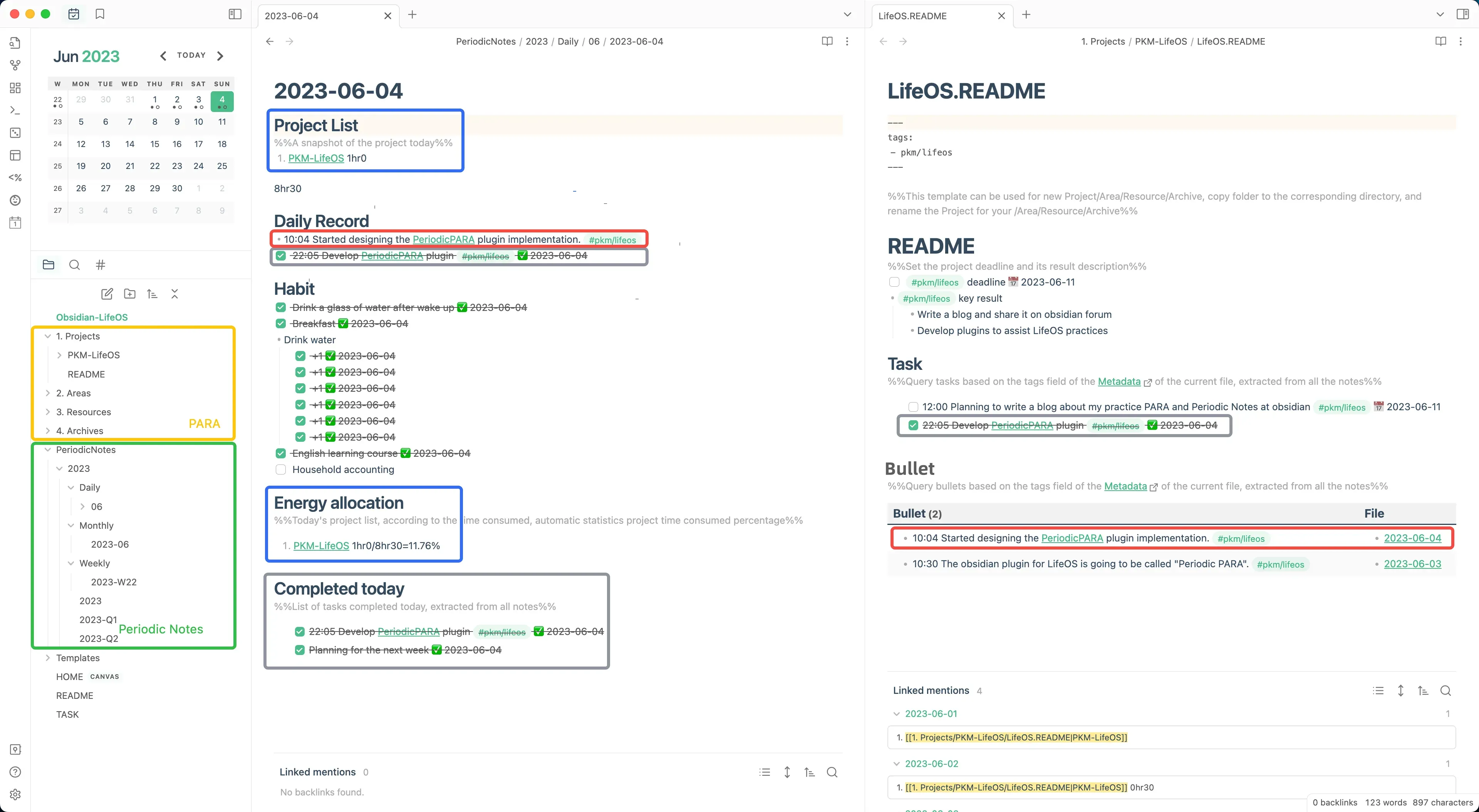 Treat the first-level folders under PARA as special tags (It is not necessary to match the file name exactly, as long as the "tags" property in the *.README.md file is unique.), and use them in "Periodic Notes." This allows for a uniform index across all the first-level folders in the same manner. This ensures that the README.md index under each PARA folder has all the context of the current topic: