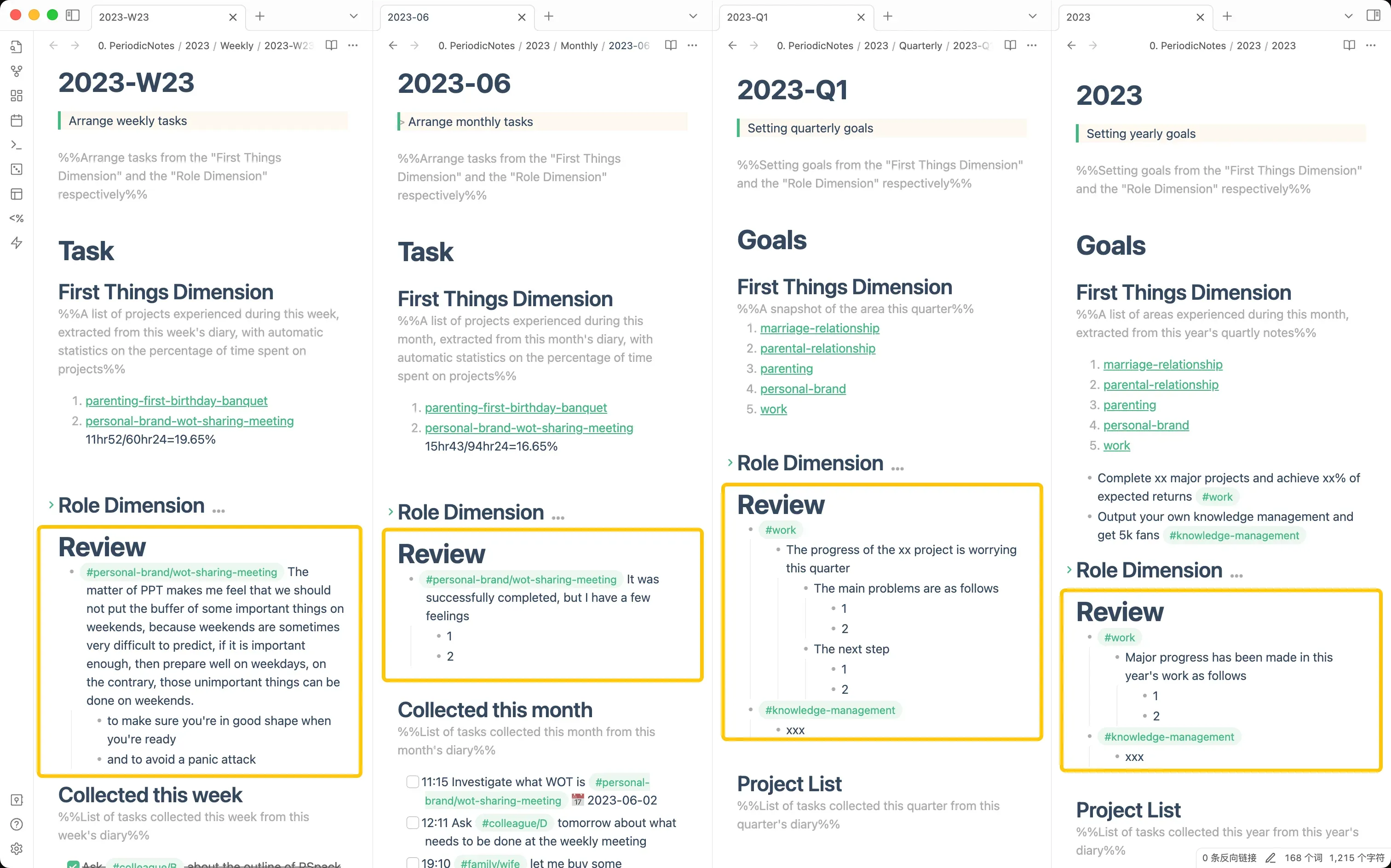 Reviews mainly focus on tasks, projects, or goals within the current period, while simultaneously planning tasks, projects, or goals for the next period!
