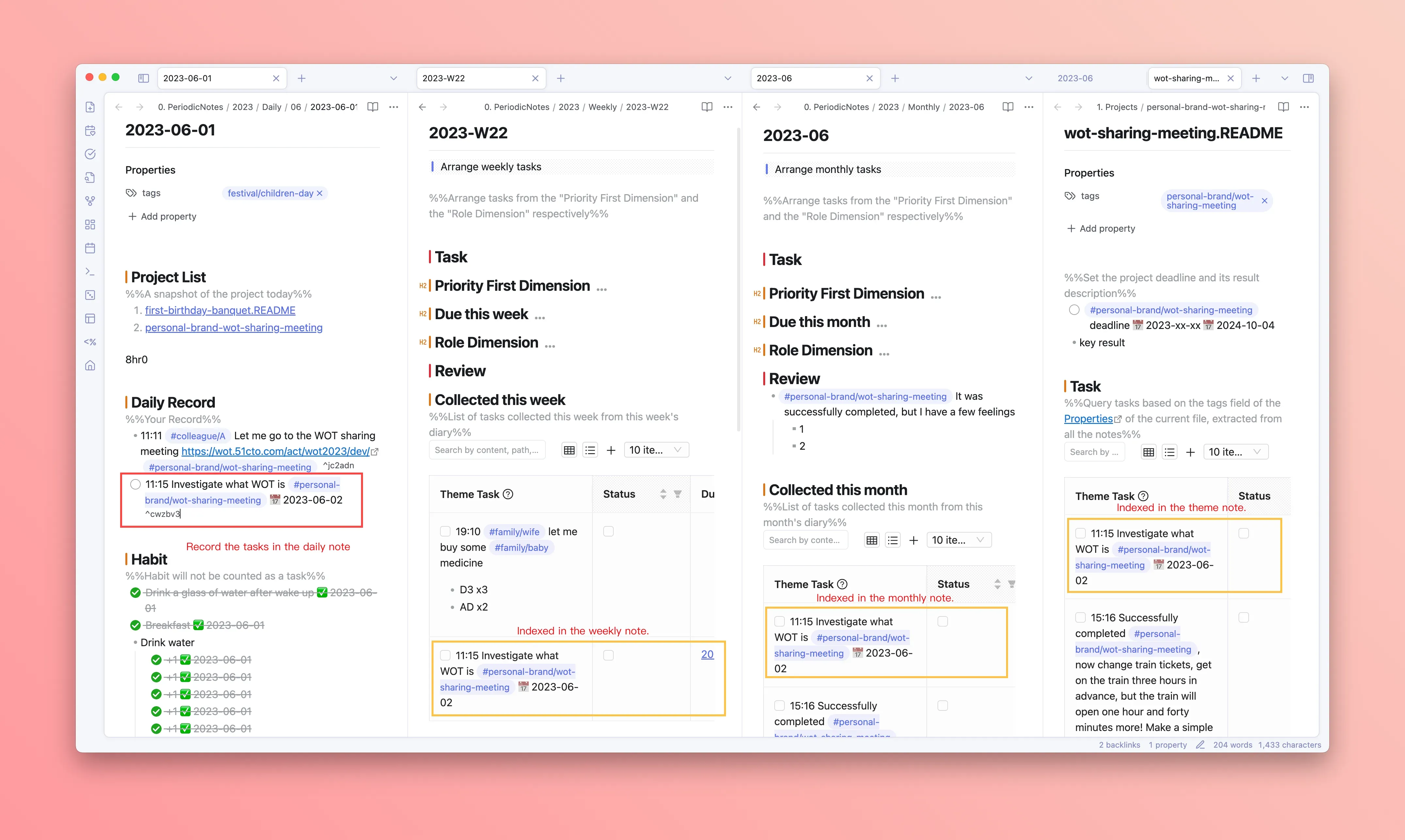 Since tasks collected are easily accessible in various modules, you can plan "Weekly Notes" and "Monthly Notes" by placing tasks as "Block Links and Block References" into corresponding modules as "this week's" or "this month's" to-do items!