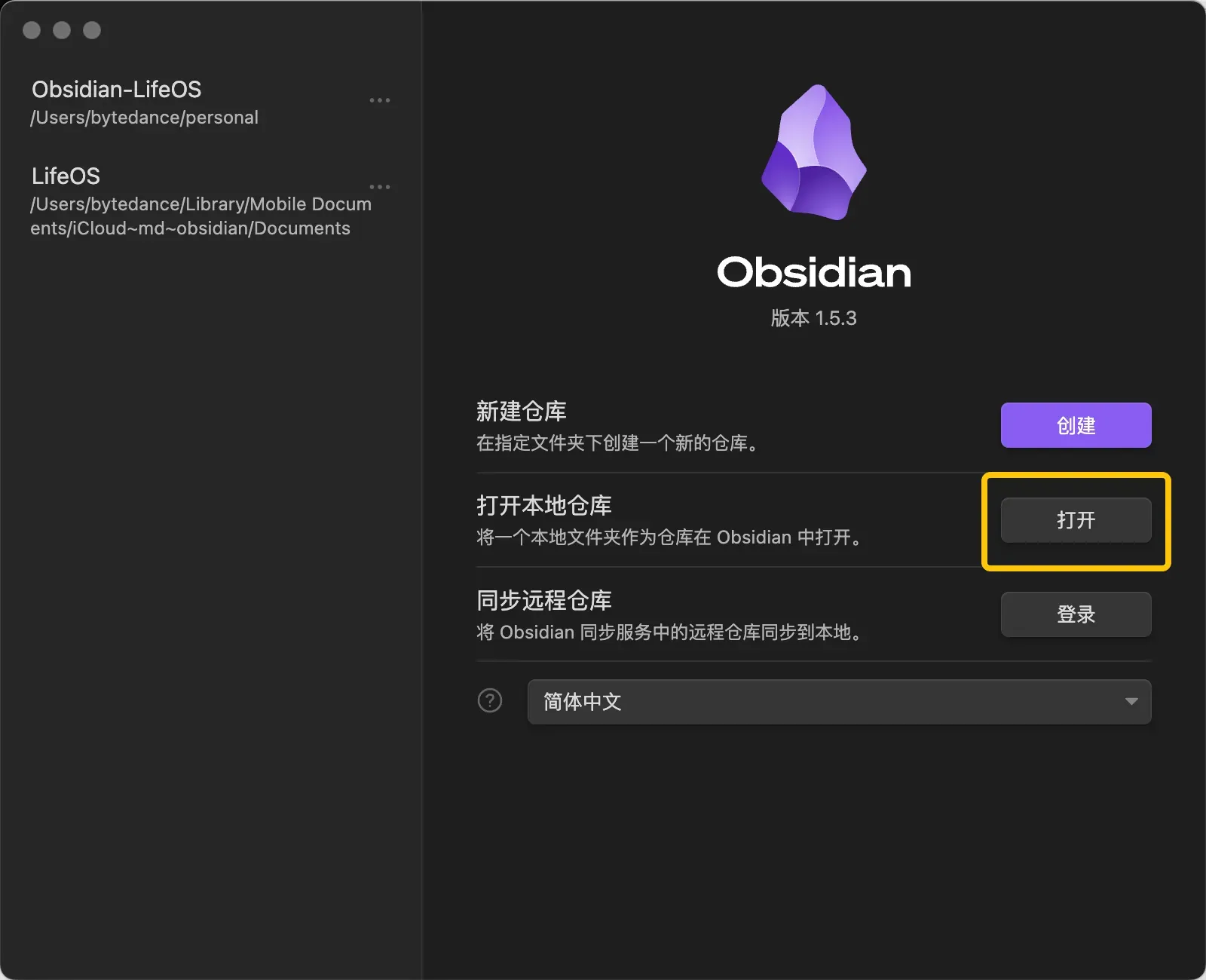 打开 Obsidian 软件,点击左下角切换库,接着点击『管理仓库』