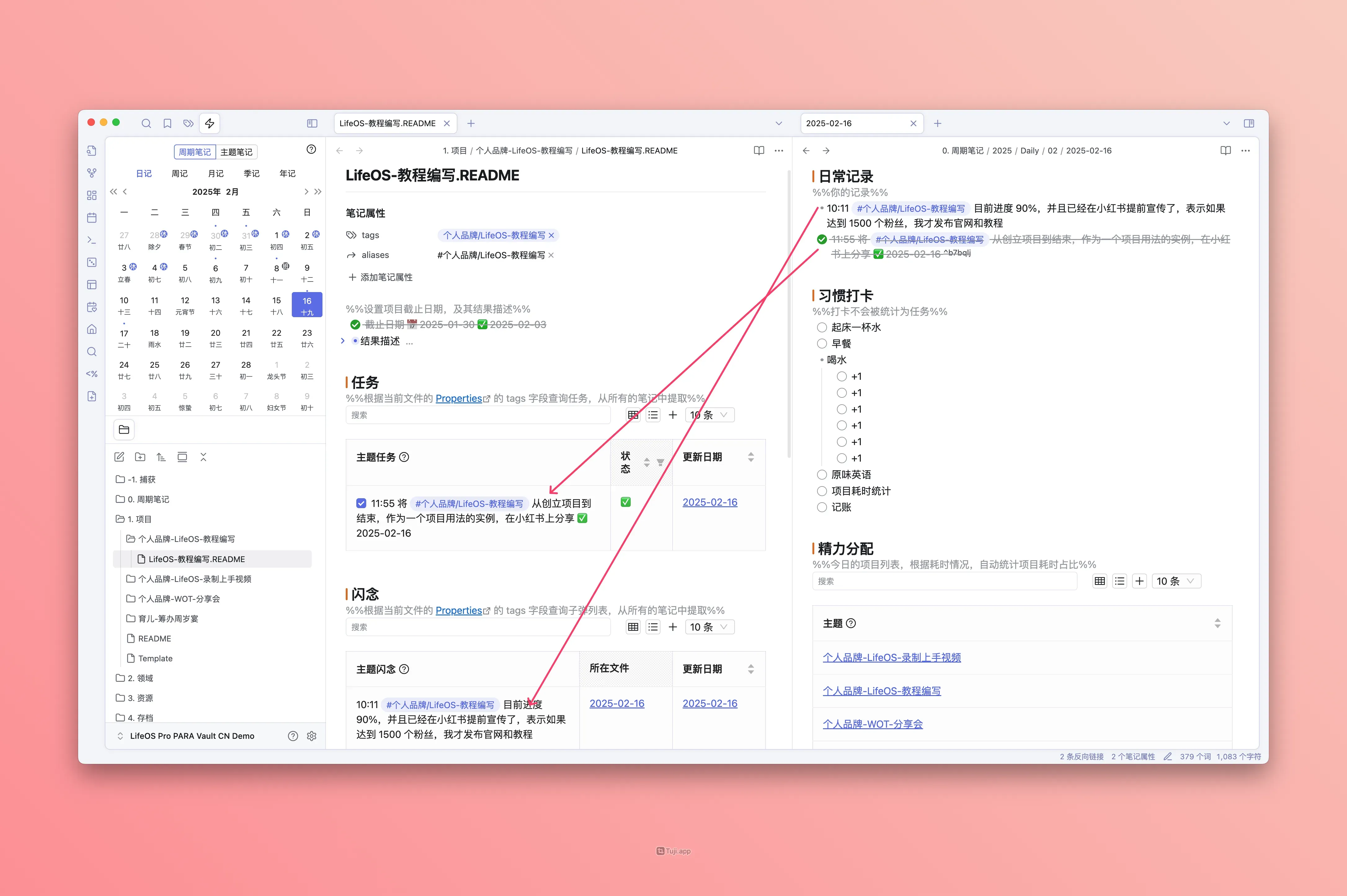 然后,在往后的日记中,我会记录所有关于这个 『个人品牌/LifeOS-教程编写』项目的想法和灵感,同时也列出了一些待办的任务,并为这些记录打上『项目』对应的标签,即『#个人品牌/LifeOS-教程编写』;