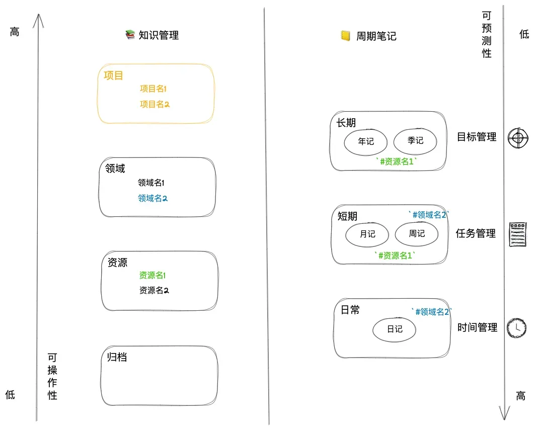 LifeOS 的核心采用两套系统,一个是知识管理系统,另一个是周期笔记系统,前者采用 PARA 系统,以『项目』、『领域』、『资源』为维度,进行知识管理,后者以时间为维度,通过记录『日记』、『周记』、『月记』、『季记』、『年记』,进行任务/目标/时间管理。