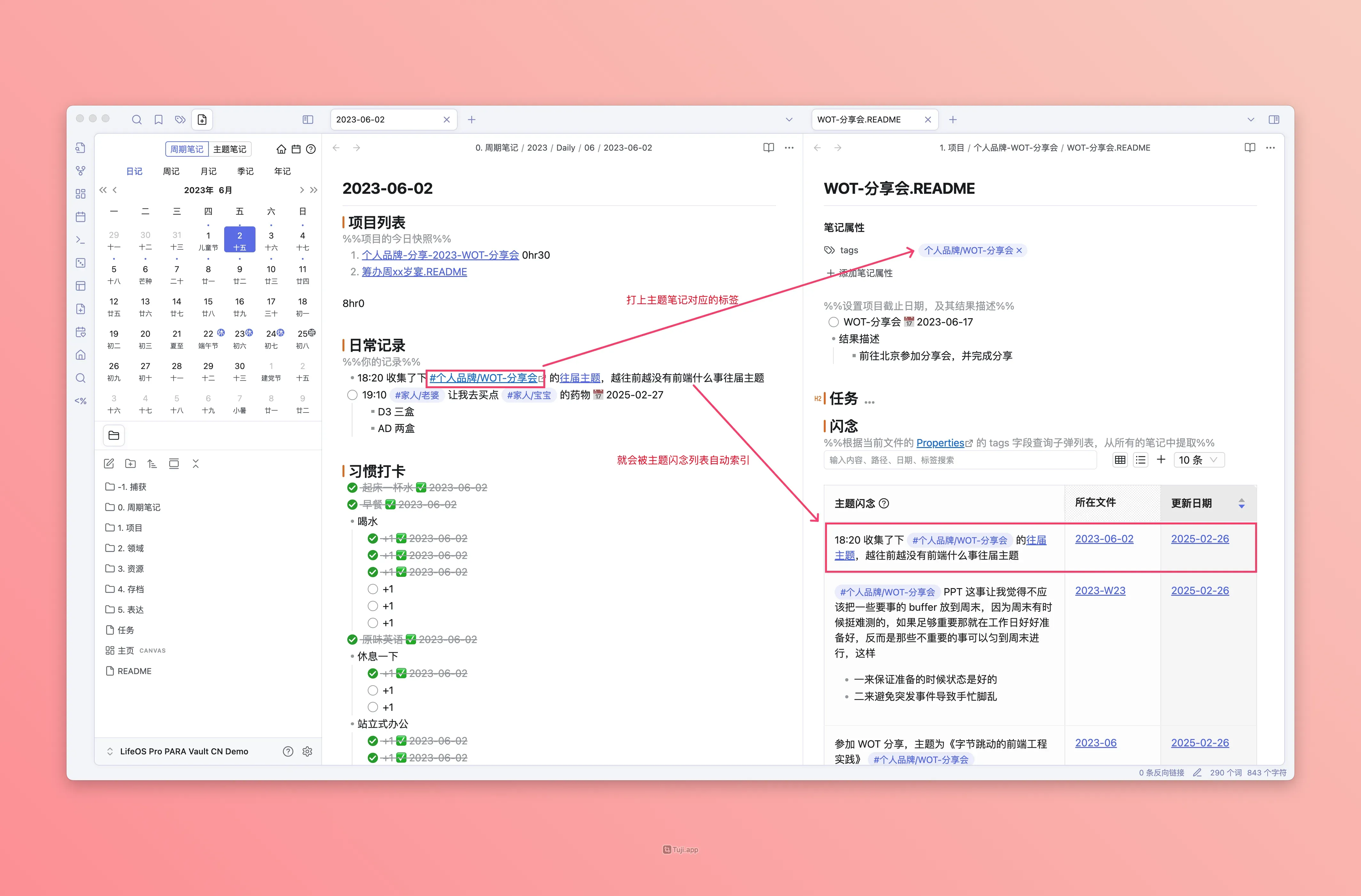 每个主题(PARA)都有一个索引文件(以 .README 结尾或者与文件夹同名),在该索引文件中,存在三种高级列表,即『主题任务』、『主题闪念』、『主题文件』,它用来索引散落在整个仓库中『被打上当前主题标签』的『主题任务』、『主题闪念』、『主题文件』!